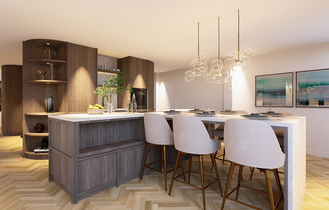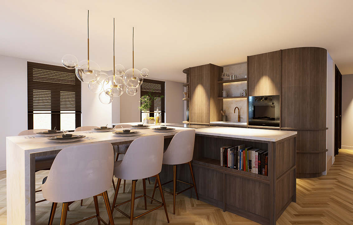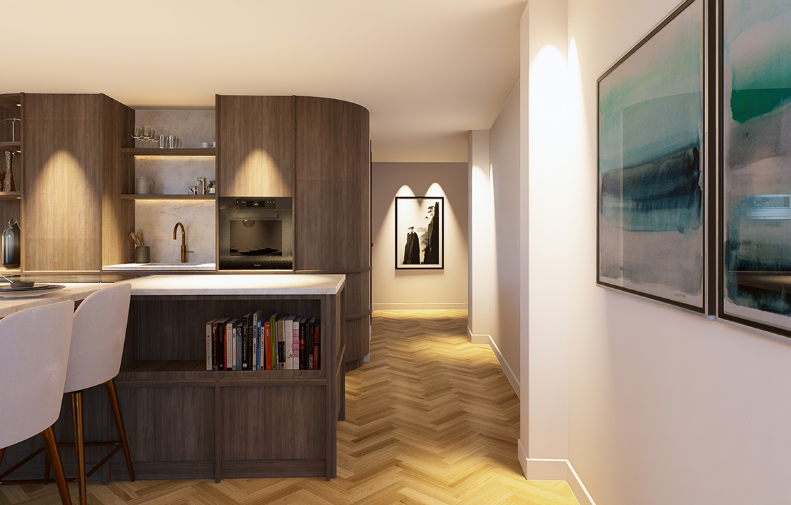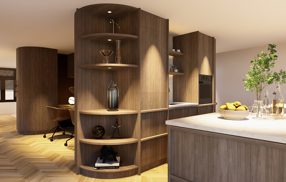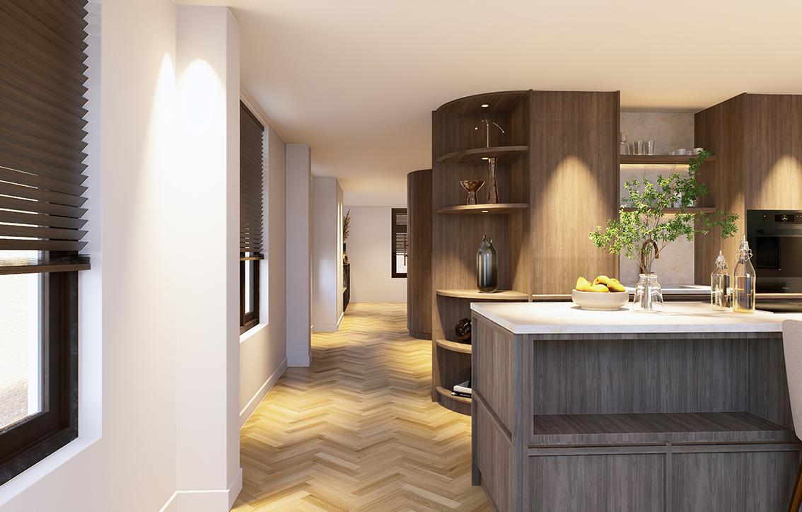 de op maat gemaakte kastenwand. Een appartement waarin maatwerk niet alleen zichtbaar is, maar voelbaar in elke ruimte.”