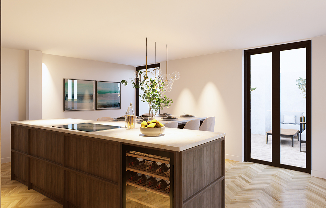 Maryse: “In het appartement hebben we alles tot in detail op maat ontworpen. De keuken vormt direct de eyecatcher bij binnenkomst – met een vrijstaand kookeiland van notenhout, speciaal ontworpen met veel bergruimte en een sterke, warme uitstraling. Het uitzicht op het dakterras, ontworpen door een tuinarchitect zorgt voor een mooie verlenging van de ruimte. De indeling loopt vloeiend in elkaar over. Vanuit de keuken gaat de ruimte over in een tussenliggende werkplek, die weer doorloopt naar een comfortabele living met volop bergruimte en een haard als sfeervol middelpunt.